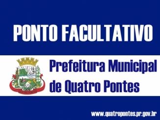 Fica estabelecido Ponto Facultativo para os estabelecimentos Comerciais, do Município de Quatro Pontes, para o dia 09/02/2016 (terça-feira) – período integral e 10 de fevereiro de 2016 (quarta-feira) – período matutino, recomeçando o funcionamento normal a partir das 13:30 horas.