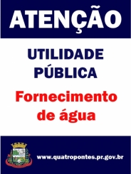 O Serviço de Abastecimento da Prefeitura Municipal de Quatro Pontes comunica que haverá interrupção no fornecimento de água nesta quinta-feira, dia 16, durante o dia todo, por motivo da aplicação de melhorias no sistema de distribuição. A interrupção irá alcançar mais de 50% da população urbana, em toda a parte da cidade situada desde a Avenida Presidente Epitácio em direção a Prefeitura, incluindo o Parque Industrial I e II (todo o lado sul do município).