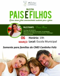 Tendo por local a Escola Municipal Dona Leopoldina, palestra intitulada “Pais e filhos: como educar filhos emocionalmente saudáveis para o futuro” será ministrada para as famílias do Centro Municipal de Educação Infantil (Cmei) Cantinho Feliz na noite de hoje (06), a partir das 19 horas.