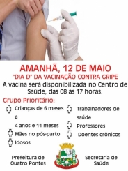 Amanhã (12), em Quatro Pontes, a Secretaria de Saúde realizará o “Dia D” da vacinação contra a gripe. A vacina, que é trivalente (o Influenza A, nas variações H1N1 e H3N2 e influenza B), será disponibilizada das 08 às 17 horas, sem intervalo para o almoço, no Centro de Saúde. Para recebê-la, é necessário apresentar o cartão de vacinação.