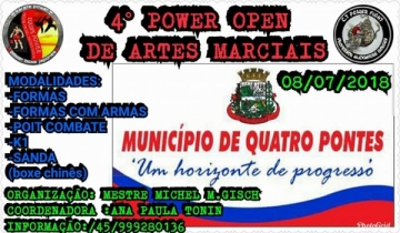 O Ginásio de Esportes do Complexo Escolar de Quatro Pontes será palco do 4º Power Open de Artes Marciais, organizado pela Secretaria de Desenvolvimento Social, por meio do mestre Michel Matias Gisch, e o Departamento de Esportes.