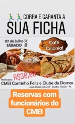 Fichas estão sendo vendidas a R$ 30 adulto e R$ 12 infantil (oito a 12 anos) no Cmei, com funcionários e sócias do Clube de Damas, devendo ser adquiridas até o final da tarde de hoje (06). Reservas também podem ser feitas pelos telefones (45) 3279-8121 ou 99984-0447.