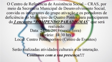 Acontecerá hoje (24), com início às 14h30, o 1º Encontro Rompendo Paradigmas, no Centro de Eventos Seno José Lang de Quatro Pontes. O Centro de Referência de Assistência Social (Cras), por meio da Secretaria de Desenvolvimento Social, tem o intuito de ofertar atividades culturais e de interação. O público-alvo são os integrantes do Grupo Ativação de Dança Sênior e os portadores de necessidades especiais.