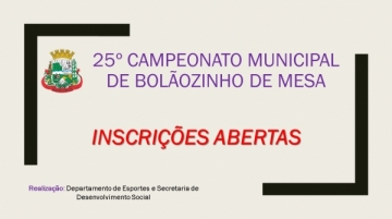Seguem somente até segunda-feira (17) as inscrições do 25º Campeonato Municipal de Bolãozinho de Mesa de Quatro Pontes, organizado pelo Departamento de Esportes e a Secretaria de Desenvolvimento Social, na categoria feminino adulto. Elas devem ser feitas com Marlene ou Alex pelos telefones 3279-8117/99984-0436 ou 98831-8107, respectivamente. A taxa é de R$ 15 por equipe.