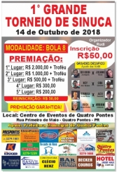 Está marcado para domingo (14) o 1º Grande Torneio de Sinuca, na modalidade bola 8, no Centro Poliesportivo Seno José Lang, em Quatro Pontes. A competição é organizada por Rudi e conta com o apoio da prefeitura, por meio do Departamento de Esportes. O início é às 14 horas.