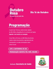 O secretário de Saúde, Marco Antônio Wickert, convida toda população feminina para que prestigie e participe das ações do Outubro Rosa. “É importante se engajar nesta iniciativa. É uma programação gratuita para você, mulher. Lembrando que as coletas de preventivo e agendamentos de mamografias, assim como os testes rápidos, são oferecidos durante todo ano. Somente é preciso procurar o serviço de saúde e agendar o melhor horário”, afirma.