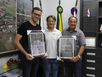 Título de honra ao mérito foi entregue hoje (20) ao prefeito de Quatro Pontes, João Laufer, e ao secretário de Administração, vice-prefeito Tiago Hansel, pelo prefeito de Santa Tereza do Oeste e diretor de Cultura e Eventos da Associação dos Municípios do Oeste do Paraná (Amop), Elio Marciniak (Kabelo).