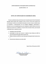 Voltada aos professores, pais de alunos e funcionários, bem como quaisquer membro da comunidade interessado em prestar serviços ou acompanhar o desenvolvimento de atividades pedagógicas, administrativas e financeiras, uma assembleia geral do Centro Municipal de Educação Infantil (Cmei) Cantinho Feliz ocorrerá no próximo dia 04, às 19h30, na Casa da Cultura.