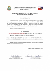 O Departamento de Esportes, no uso de suas atribuições legais e em comum acordo com as equipes finalistas, marcou para sexta-feira (12) a 31ª rodada e último jogo do 21º Campeonato Municipal de Bocha de Quatro Pontes. A disputa pelo título será entre as equipes Chapeação Stelter/Trans Brandt e Associação Esmaga Sapo, no Bar e Bocha do Gordo. O início da partida será às 19h15.