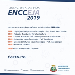 A Secretaria de Educação, Cultura e Esportes de Quatro Pontes realiza a partir de hoje (15) as inscrições para as aulas preparatórias gratuitas aos inscritos no Exame Nacional para Certificação de Competências de Jovens e Adultos (Encceja) 2019. Elas devem ser feitas até o dia 09 de agosto na recepção da prefeitura ou pelo telefone 3279-8100.