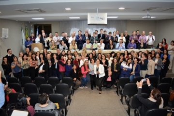 Prefeitos, vice-prefeitos, secretários de Educação e gestores de ensino participaram, na manhã de hoje (31), da 5ª Assembleia Geral Ordinária da Associação dos Municípios do Oeste do Paraná (Amop), em Cascavel, ocasião em que aprovaram por unanimidade de votos a resolução nº 003/2019, referente a uma proposta pedagógica curricular de Educação Infantil e Ensino Fundamental (anos iniciais) da rede municipal de 53 cidades da região Oeste, todas de abrangência da Amop, que foi elaborada e discutida em formato coletivo. Quatro Pontes integra o grupo e esteve representado pelo prefeito João Laufer, a secretária de Desenvolvimento Social, primeira-dama Odete Laufer, e a secretária de Educação, Cultura e Esportes, Araceli Basso Tauchert. Para a ocasião, também foram convidados chefes de Núcleos Regionais de Educação, coordenadores pedagógicos e conselheiros municipais.