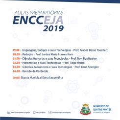 Hoje (19), seguindo até sábado (24), iniciarão as aulas preparatórias gratuitas para os inscritos no Exame Nacional para Certificação de Competências de Jovens e Adultos (Encceja) 2019, na Escola Municipal Dona Leopoldina, de Quatro Pontes. A iniciativa é da Secretaria de Educação, Cultura e Esportes, com ensino de professores voluntários, totalizando 35 inscritos.