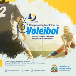 O Departamento de Esportes de Quatro Pontes realizará até o dia 16 de setembro as inscrições para o 6º Campeonato Municipal de Voleibol, podendo ser pessoalmente no Centro Poliesportivo Seno José Lang ou por meio dos telefones 99984-0436 ou 3279-8117 (com Marlene) ou 99915-4645 (com Juliano), sem custos.