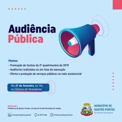 O Fundo Municipal de Saúde, de Quatro Pontes, realizará às 14 horas desta quinta-feira (27) uma audiência pública na Câmara de Vereadores, com a convocação da população em geral para participar.
