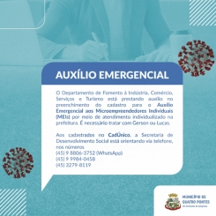 Por esse motivo, a Prefeitura de Quatro Pontes, através do Departamento de Fomento à Indústria, Comércio, Serviços e Turismo e da Secretaria de Desenvolvimento Social, está auxiliando os munícipes no preenchimento deste cadastro. O Departamento de Fomento à Indústria, Comércio, Serviços e Turismo presta atendimento individualizado na prefeitura, com Gerson e/ou Lucas, sendo importante trazer consigo um celular ativo para a validação do código. Logo, aos cadastrados no Cadastro Único (CadÚnico), a Secretaria de Desenvolvimento Social orienta via telefone, pelos números (45) 98806-3752 (WhatsApp), 99984-0458 e 3279-8119.
