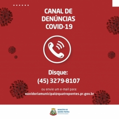 Cumprindo o decreto nº 050/2020, a Prefeitura de Quatro Pontes, por meio de comissão nomeada pelo prefeito João Laufer, conforme a portaria nº 174/2020, de 09 de abril de 2020, fiscaliza o funcionamento de atividades e estabelecimentos industriais, comerciais e de prestação de serviços, como medida para enfrentamento da emergência de saúde pública de importância internacional/nacional decorrente do novo coronavírus (Covid-19). A partir de hoje (24), os munícipes também podem contatar o Canal de Denúncias Covid-19 pelo 3279-8107 ou no e-mail ouvidoriamunicipal@quatropontes.pr.gov.br. O canal está visível no site do município, no endereço www.quatropontes.pr.gov.br.