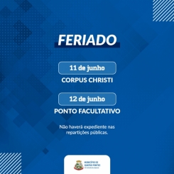 Está estabelecido para o serviço público municipal de Quatro Pontes, sem prejuízo da prestação dos serviços considerados essenciais, ponto facultativo na sexta-feira (12), em razão do feriado de Corpus Christi amanhã (11), conforme o decreto nº 006/2020, de 06 de fevereiro de 2020.