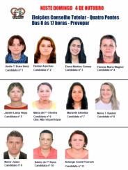 Neste domingo, dia 4 de outubro, acontecerá a eleição dos novos membros do Conselho Tutelar de Quatro Pontes. A votação começa às 8 horas e se estende até as 17 horas, no Provopar. Podem votar todos os eleitores do município de Quatro Pontes.