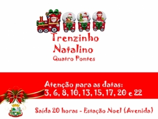 Integrando as ações da programação natalina de Quatro Pontes, começam nesta quinta-feira (03) os passeios de trenzinho pela cidade. A saída será a partir das 20 horas, na Estação Noel, situada na Avenida Presidente Epitácio.