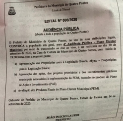 O Prefeito do Município de Quatro Pontes, no uso de suas atribuições legais, convoca a população em geral para a 4ª Audiência Pública - Plano Diretor Municipal, por meio de transmissão online ao vivo, a ser realizada no dia 30 de setembro de 2020, na Casa da Cultura do Município de Quatro Pontes, com início às 19h30, com a seguinte pauta: