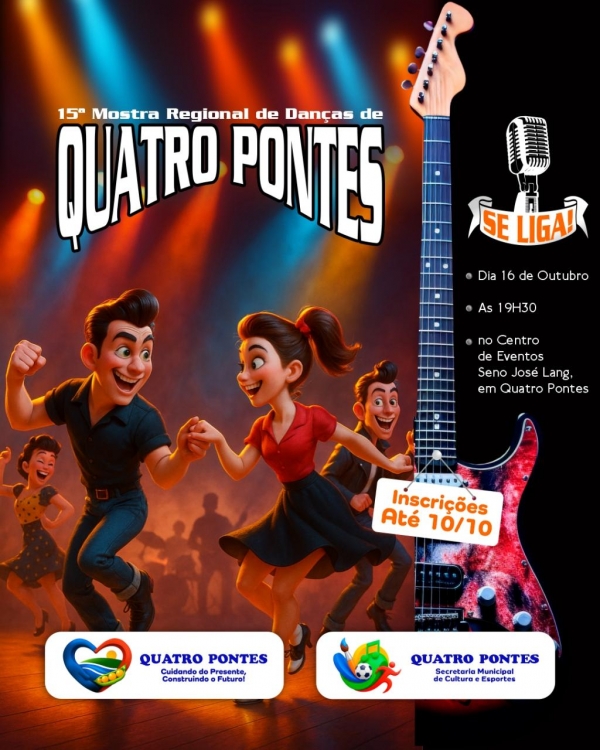 Quatro Pontes, 6 de outubro de 2025 – A Prefeitura Municipal de Quatro Pontes, por meio da Secretaria de Cultura e Esportes, anuncia a realização da XV Mostra Regional de Danças de Quatro Pontes, que acontecerá no dia 16 de outubro de 2025 (quinta-feira), a partir das 19h30, no Centro de Eventos Seno José Lang.