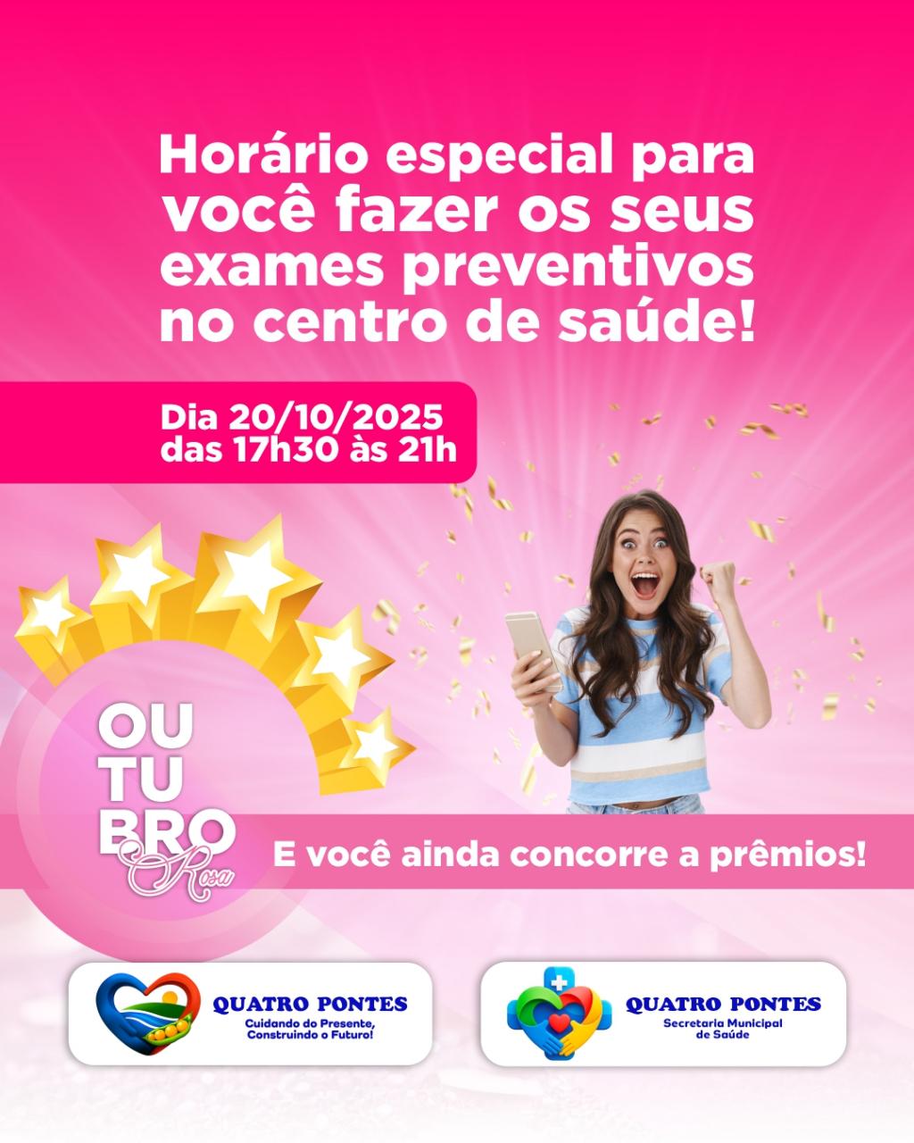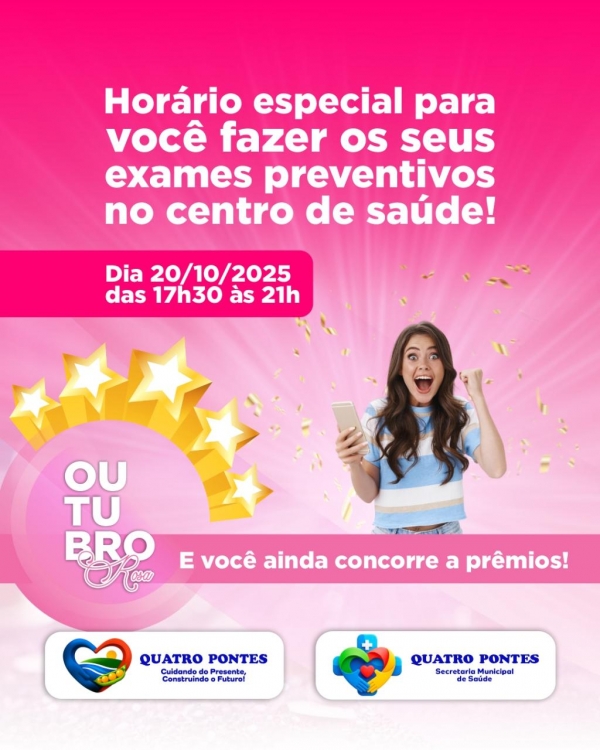 Quatro Pontes, 09 de outubro de 2025 – A Prefeitura Municipal de Quatro Pontes, por meio da Secretaria de Saúde, informa que o Centro de Saúde atenderá em horário especial no dia 20 de outubro (segunda-feira), das 17h30 às 21h, em alusão à Campanha Outubro Rosa 2025.
