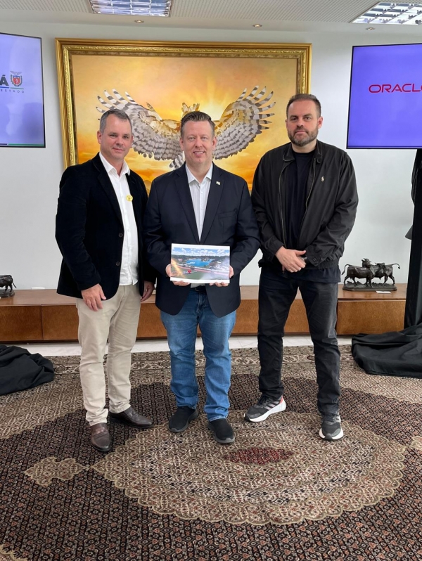 Quatro Pontes, 23 de outubro de 2025 – O prefeito de Quatro Pontes, Cesar Seidel (Canela), esteve na tarde de quarta-feira (22) em Curitiba para apresentar o projeto de construção do Lago Municipal de Quatro Pontes ao Governo do Estado do Paraná. A reunião foi realizada com o chefe de gabinete do governador, Darlan Scalco, e contou com a intermediação do deputado estadual Hussein Bakri, líder do governo na Assembleia Legislativa, além do acompanhamento do assessor parlamentar Emmanuel Gabardo Taques.