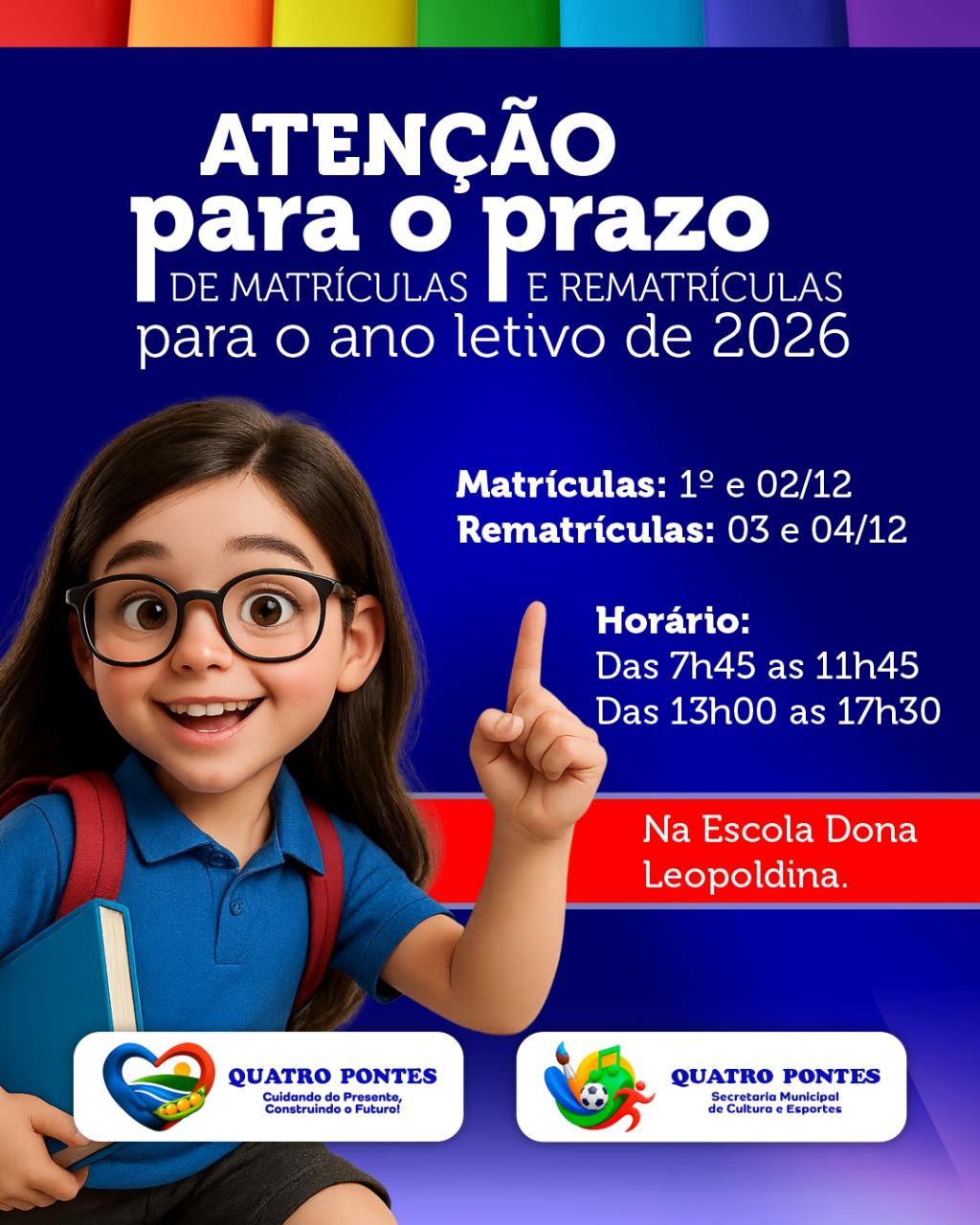 Quatro Pontes, 27 de novembro de 2025 – A Secretaria Municipal de Educação informa o período de matrículas e rematrículas para o ano letivo de 2026 na Escola Municipal Dona Leopoldina, no CMEI Cantinho Feliz e no CMEI Clarice Maria Bremm.