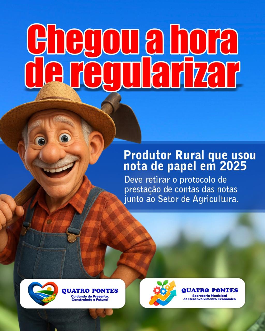 Diante da mudança, os produtores rurais que utilizaram notas fiscais em papel ao longo do ano de 2025 e que ainda não realizaram a devida regularização devem procurar, com a maior brevidade possível, o Setor do Produtor Rural para apresentar a documentação necessária e efetuar a baixa das notas utilizadas.
