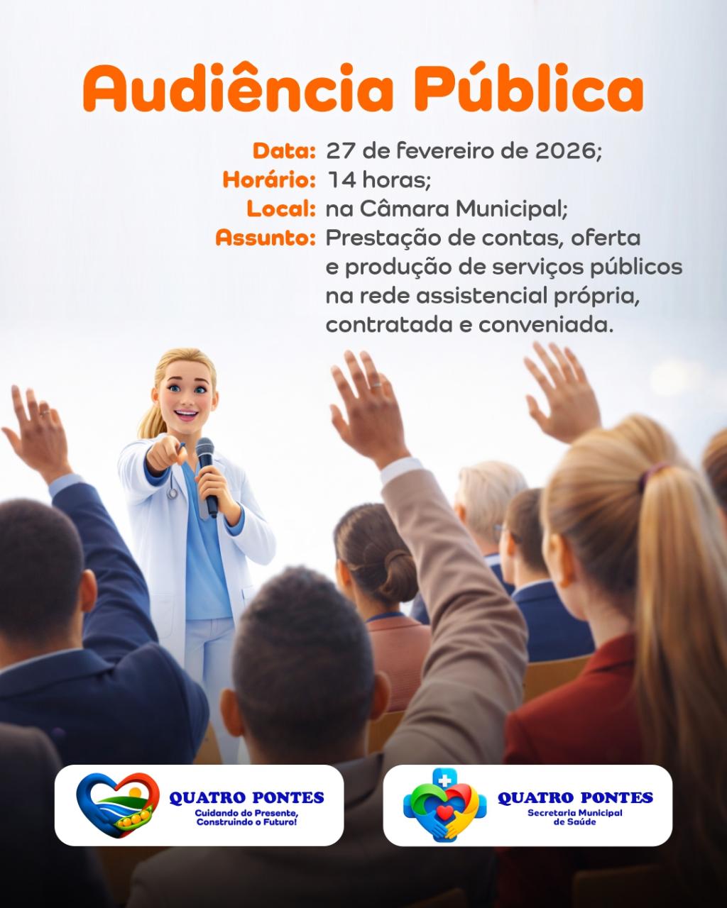 Quatro Pontes, 24 de fevereiro de 2026 – A Câmara Municipal de Quatro Pontes realiza, no próximo dia 27 de fevereiro (sexta-feira), às 14h, Audiência Pública para apresentação da prestação de contas da área da saúde referente ao 3º quadrimestre do exercício de 2025.