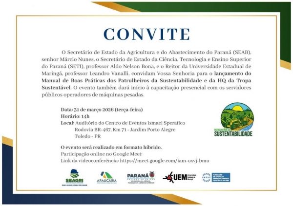 O convite é assinado pelo secretário de Estado da Agricultura e do Abastecimento, Márcio Nunes, pelo secretário de Estado da Ciência, Tecnologia e Ensino Superior, Aldo Nelson Bona, e pelo reitor da Universidade Estadual de Maringá, Leandro Vanalli.