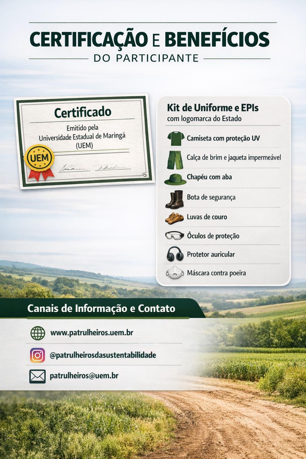 A formação integra o programa Patrulheiros da Sustentabilidade e terá carga horária total de 80 horas, com certificação emitida pela Universidade Estadual de Maringá.