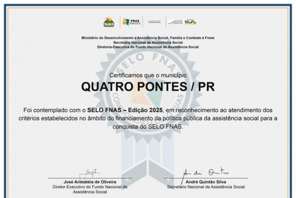 Quatro Pontes, 2 de abril de 2026 – O município de Quatro Pontes foi contemplado com o Selo FNAS – Edição 2025, reconhecimento concedido pelo Ministério do Desenvolvimento e Assistência Social, Família e Combate à Fome, por meio do Fundo Nacional de Assistência Social.