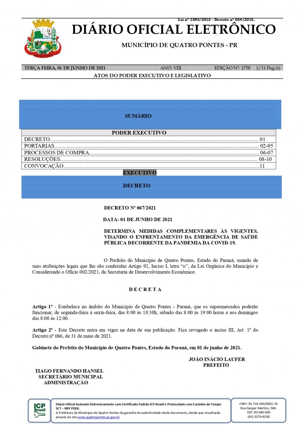 Considerando o ofício nº 002/2021 da Secretaria de Desenvolvimento Econômico de Quatro Pontes, novo decreto (nº 067/2021) foi publicado ontem (1º), no Diário Oficial, com medidas complementares às vigentes para o enfrentamento da emergência de saúde pública decorrente da pandemia da Covid-19.