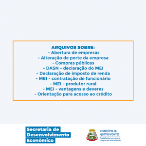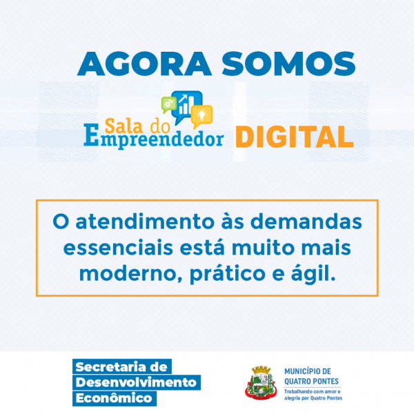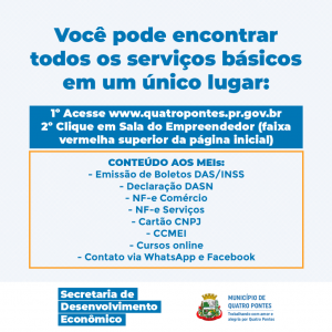 Com o propósito de que os Microempreendedores Individuais (MEIs) de Quatro Pontes tenham mais praticidade e agilidade no atendimento às demandas essenciais, a Sala do Empreendedor, ligada à Secretaria de Desenvolvimento Econômico, disponibiliza todos os serviços básicos por meio da Sala do Empreendedor Digital. Para acessar o conteúdo é necessário entrar no site do município, no endereço www.quatropontes.pr.gov.br, e clicar no ícone exclusivo ‘Sala do Empreendedor Digital’ no meio da página inicial.