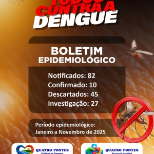 Quatro Pontes, através da Secretaria de Saúde, está confirmado na 4ª Campanha de Prevenção à Dengue Sesc Paraná, intitulada ‘Aqui o mosquito não entra’, promovida pelo Sistema Fecomércio Sesc Senac PR, em parceria com a Secretaria de Estado da Saúde (Sesa), Secretaria de Educação do Paraná, Defesa Civil, Casa Civil, Câmara da Mulher Empreendedora e Gestora de Negócios, Sindicatos filiados e prefeituras.