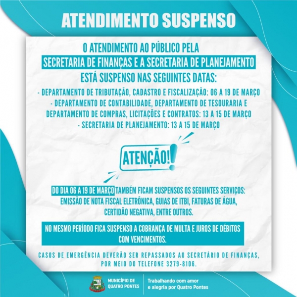 Deste modo, o Departamento de Tributação, Cadastro e Fiscalização não atenderá entre esta terça-feira até o dia 19. O Departamento de Contabilidade, Departamento de Tesouraria, Departamento de Compras, Licitações e Contratos e a Secretaria de Planejamento não terão atendimento do dia 13 a 15. E de hoje até o dia 19 também ficam suspensos alguns serviços, como a emissão de nota fiscal eletrônica; guias de ITBI; faturas de água; certidão negativa, entre outros. Fica suspensa, ainda, a cobrança de multa e juros de débitos com vencimentos no referido período.