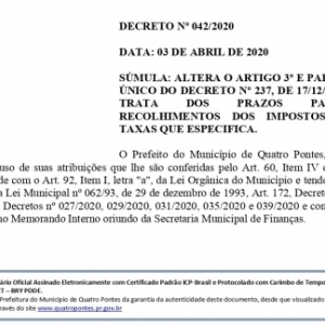 Prefeito de Quatro Pontes decreta prorrogação do vencimento da taxa de alvará