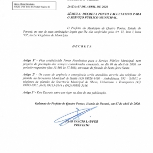 Prefeito de Quatro Pontes decreta ponto facultativo para amanhã à tarde