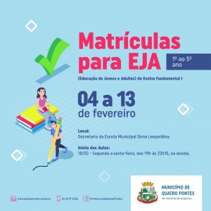 Hoje é o último dia de matrículas para a EJA em Quatro Pontes