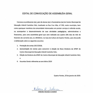 Cmei Cantinho Feliz realizará assembleia geral no próximo dia 04