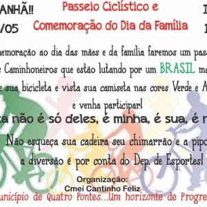 2º PASSEIO CICLÍSTICO E DIA DA FAMÍLIA ACONTECE AMANHÃ EM QUATRO PONTES