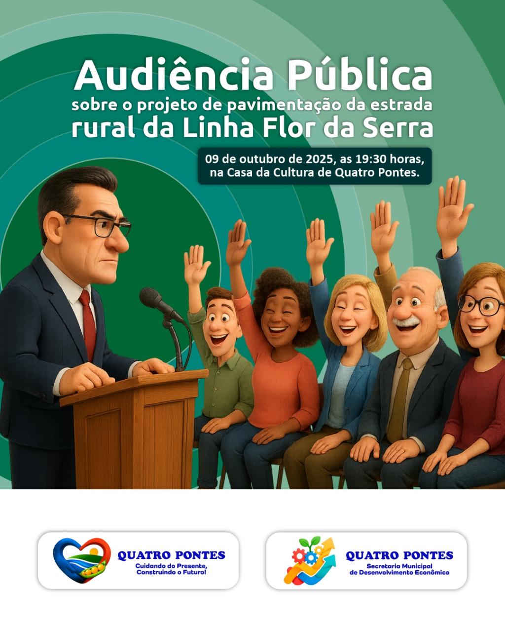 A Administração Municipal de Quatro Pontes, por meio da Secretaria de Desenvolvimento Econômico, da Secretaria de Obras, Urbanismo e Transportes e do Conselho Municipal de Desenvolvimento Rural, convida a população para participar da Audiência Pública sobre o projeto de pavimentação da estrada rural da Linha Flor da Serra, a ser realizada no dia 09 de outubro de 2025, às 19h30, na Casa da Cultura.