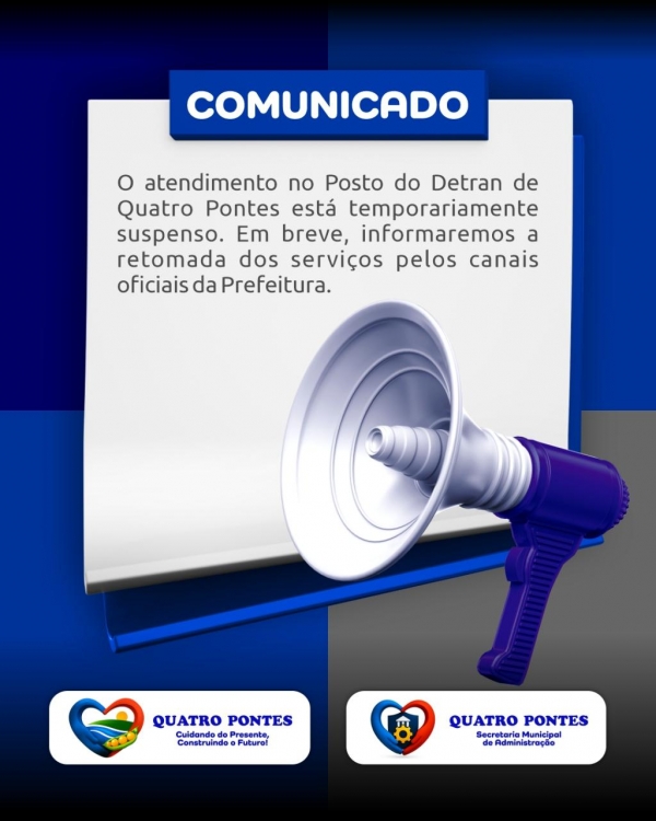A Prefeitura Municipal de Quatro Pontes informa que o atendimento no Posto do Detran está temporariamente suspenso.