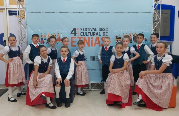 Quatro Pontes, 22 de outubro de 2025 – O Grupo Folclórico Die Kleine Tänzer participou, no dia 20 de outubro, do 4º Festival das Etnias do Sesc, realizado em Foz do Iguaçu. A apresentação foi realizada em conjunto com integrantes do grupo Tanz und Liebe, de Palotina, para estudantes do ensino fundamental e médio do Sesc local.