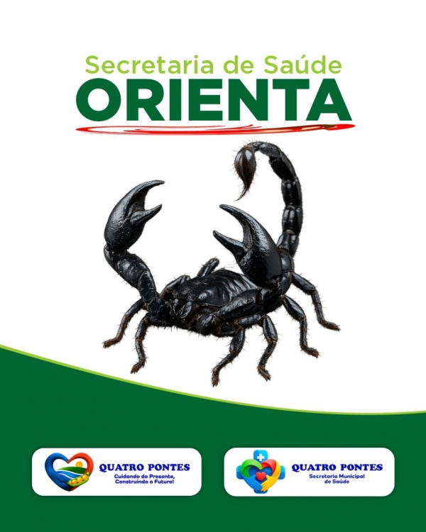 Quatro Pontes, 27 de outubro de 2025 - A Secretaria Municipal de Saúde de Quatro Pontes informa que tem recebido diversos relatos sobre a presença de escorpiões em diferentes pontos do município. Após avaliação técnica, destaca-se que o escorpião encontrado em nosso território é o escorpião-preto (Bothriurus sp.), espécie nativa da região. Este tipo de escorpião não representa alto risco à saúde humana, podendo causar apenas acidentes leves, geralmente caracterizados por dor local, sem evolução para casos graves ou fatais.