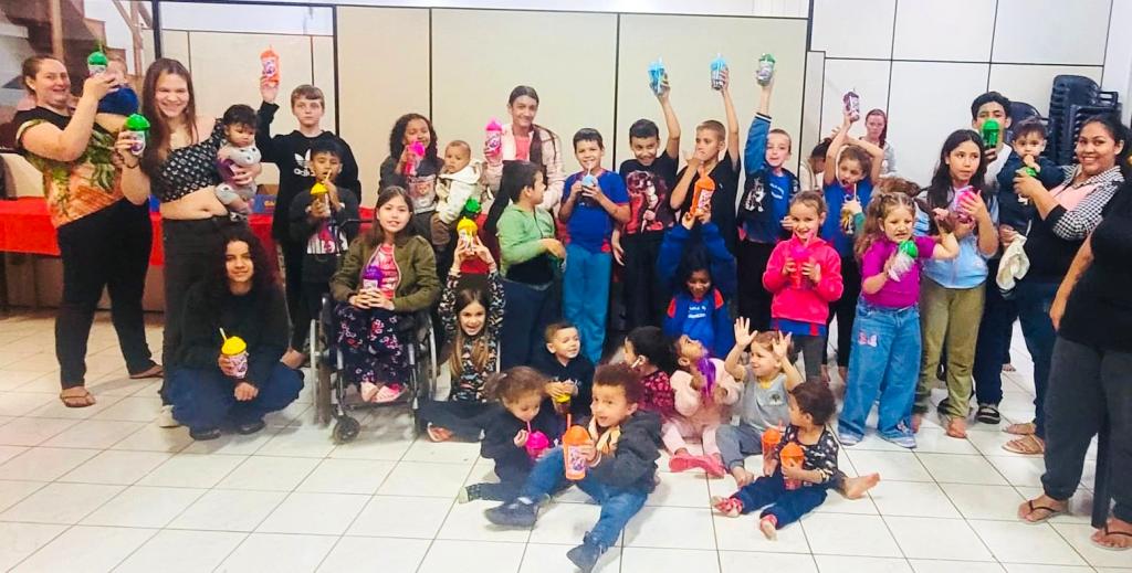 Durante a tarde, as crianças participaram de diversas atividades recreativas e dinâmicas voltadas à socialização e ao desenvolvimento coletivo. Como forma de lembrança, cada participante recebeu um copo personalizado, entregue pela equipe da Secretaria Municipal de Desenvolvimento Social, em reconhecimento à importância da presença e da participação de cada criança nos grupos.