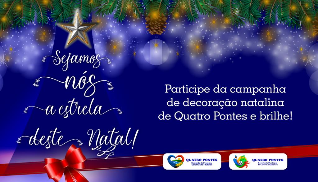 A Prefeitura de Quatro Pontes reforça que as inscrições para o Concurso de Decoração Natalina 2025 seguem abertas até o dia 28 de novembro. A iniciativa, regulamentada pelo Decreto nº 184/2025, tem como objetivo incentivar o espírito natalino, fortalecer o comércio local e valorizar a cultura e o turismo do município.