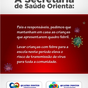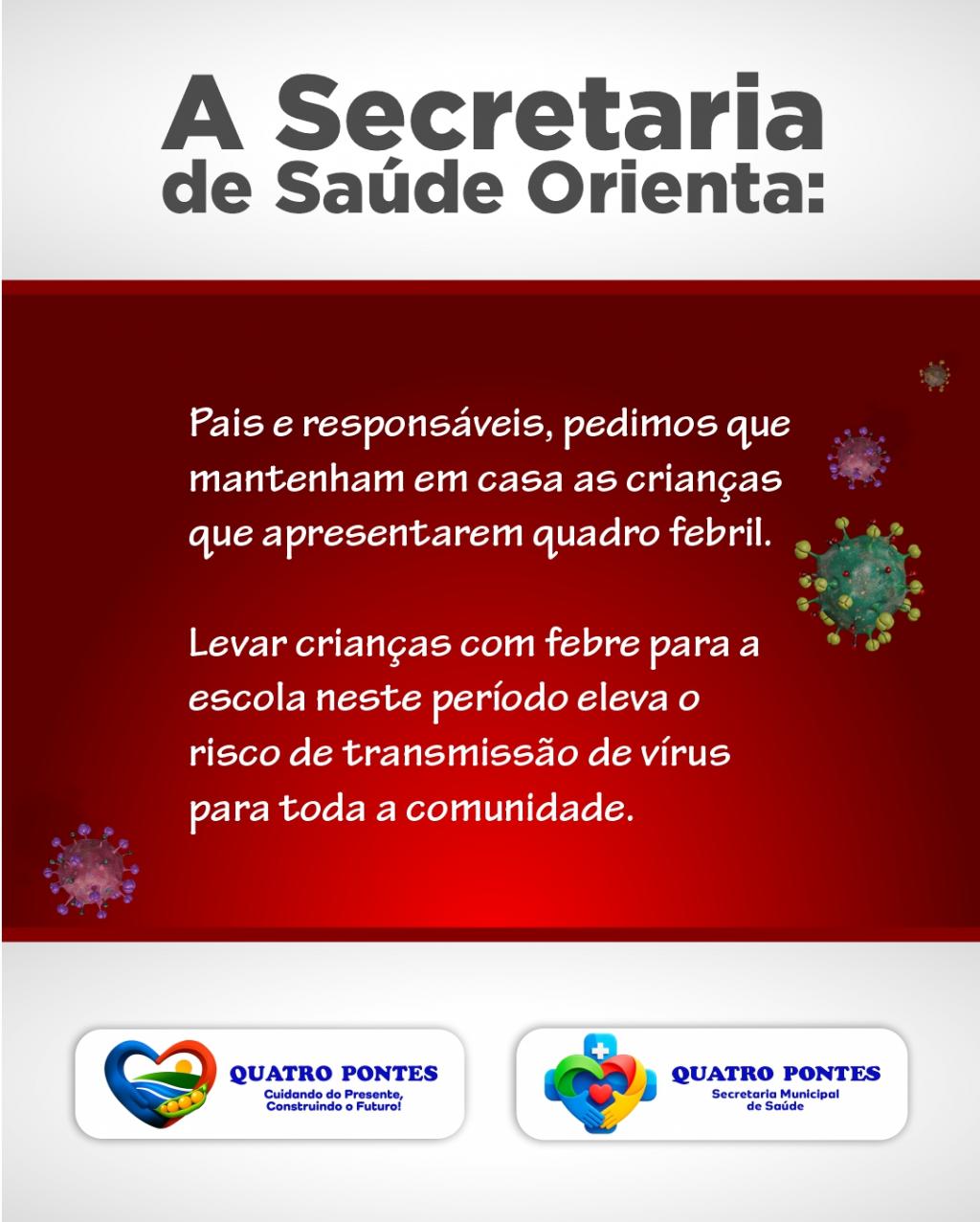 Quatro Pontes, 05 de dezembro de 2025 – A Secretaria Municipal de Saúde emitiu um alerta à comunidade devido ao aumento de casos de Influenza registrados no município nas últimas semanas. A orientação principal se dirige às famílias com crianças em idade escolar: crianças com febre ou sintomas gripais não devem ser levadas à escola, a fim de evitar a transmissão do vírus a outros estudantes e servidores.