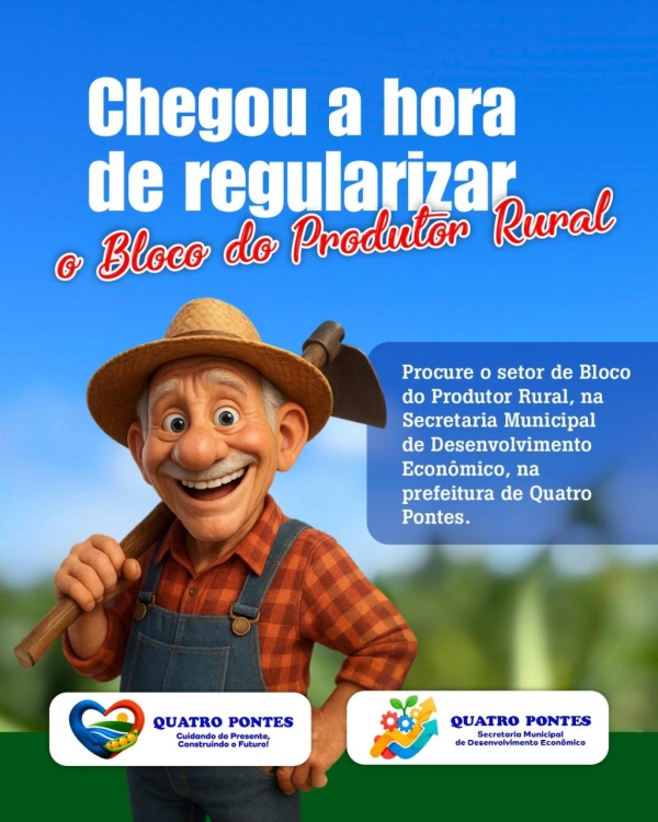 Quatro Pontes, 12 de janeiro de 2026 – A Prefeitura Municipal de Quatro Pontes, por meio da Secretaria de Desenvolvimento Econômico, informa que os produtores rurais do município devem realizar a prestação de contas e a baixa das notas fiscais de produtor rural emitidas ao longo do ano de 2025.